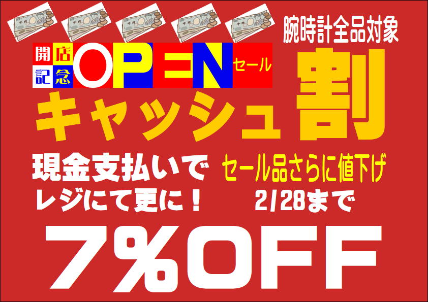更に期間中、店内腕時計やお取り寄せ腕時計を「キャッシュ割7%オフ」でのご販売!
