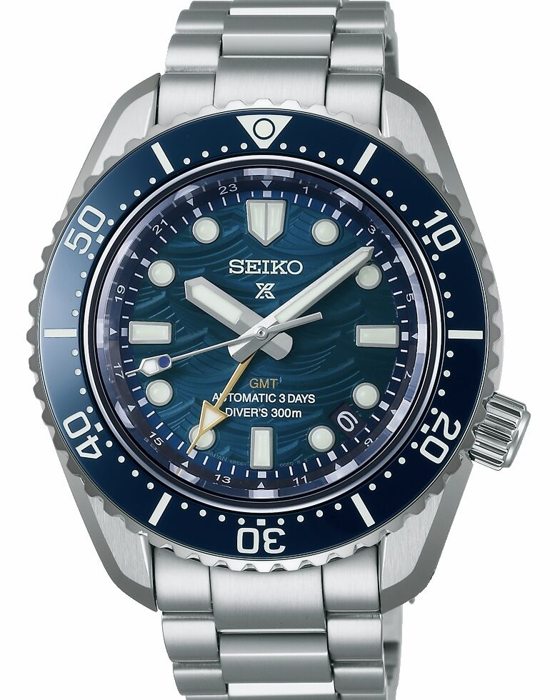 こちらの限定モデルは、セイコー ダイバーズウオッチの象徴として裏蓋に刻印されている「ウェーブマーク」をインスピレーション源として荒々しい海の情景を彷彿とさせるダイナミックな型押しパターンをダイヤルに施しています。
