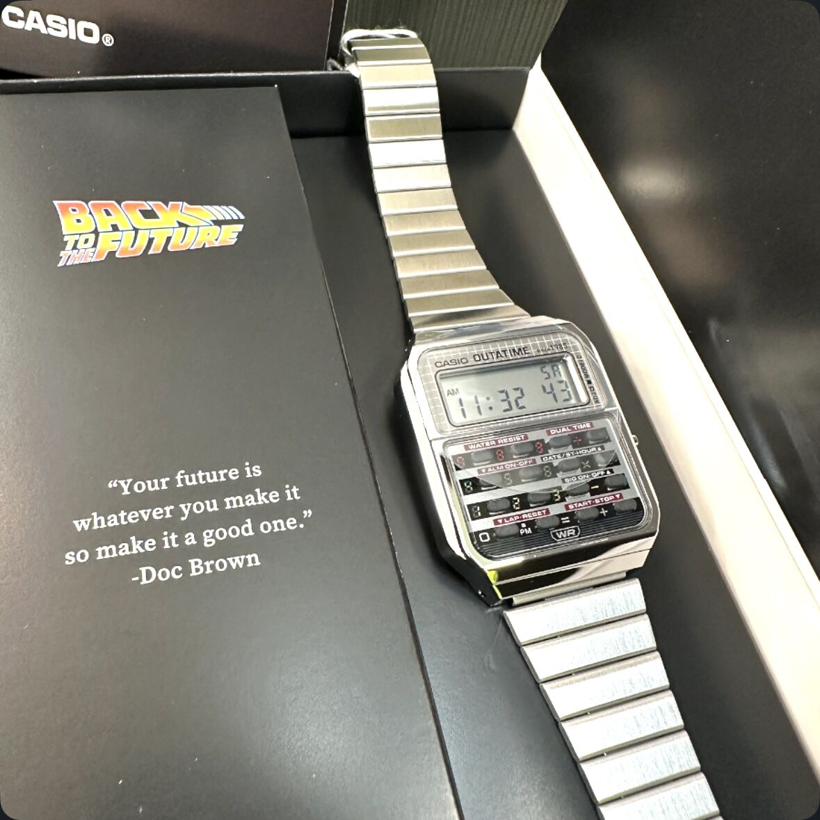 ベースモデルは1980年代から続くカシオウオッチのロングセラーCALCULATORモデルCA-500。作品を象徴するデロリアンのモチーフをフェイスに採用し映画の世界観を色鮮やかに表現。さらに、デロリアンで行き先の時間を設定するための装置「タイムサーキット」をイメージしたマルチカラーをボタン周りに施し、未来への旅を感じさせてくれます。